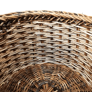 小松編みは、半芯(あけび蔓を縦に半分に割いた材料)を使用するため、かごの重量が軽く、かごの中が白っぽく仕上がるのが特徴です。
