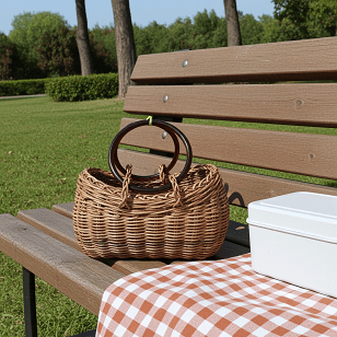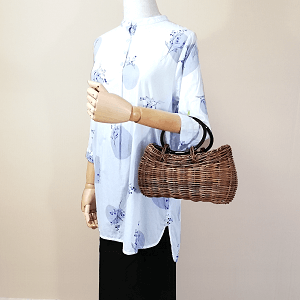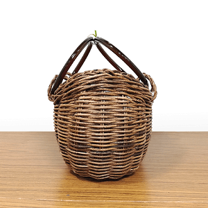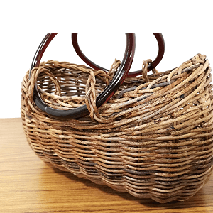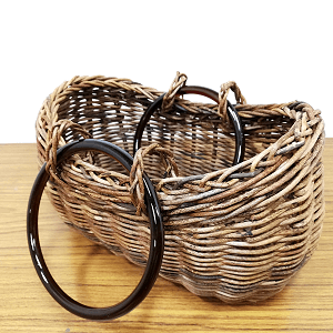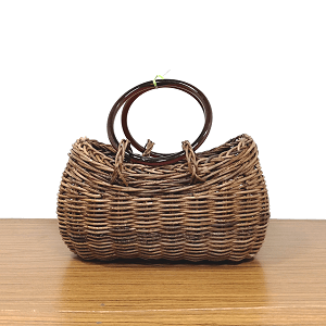 フリーハンドで仕上げた胴張り型の小さなかごに、半透明(茶)のリング型の持ち手を付けたかごバッグです。
