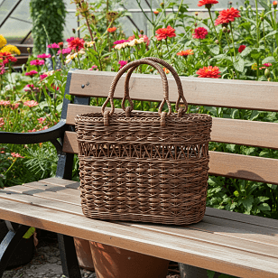 こちらの商品は、たすき編みで編み込んだ編地の上部に矢来の透かし模様を入れたかごバッグです。