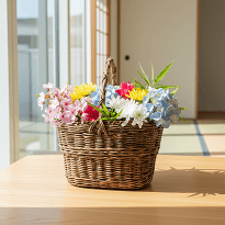 ある日は花かごとして、ある日はお出掛けにと、気軽に用途を切り替えられるコンパクトさも魅力です。