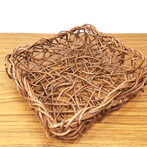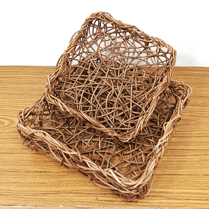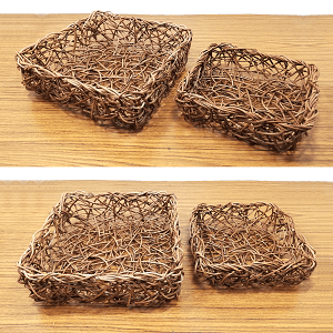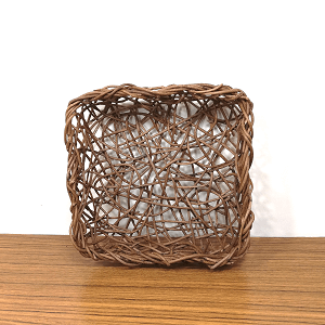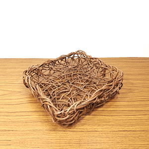 あけび蔓を乱れ編みで通しながら四角く形をつくり、正方形の型を使い5cmほどの深さを付けました。