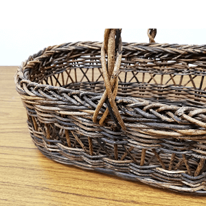 矢来の透かし模様がかご全体に編み込んであり、単にデザインとしてだけでなく、かごの強度を高めています。