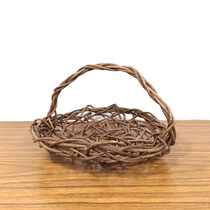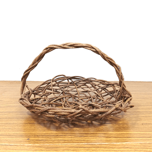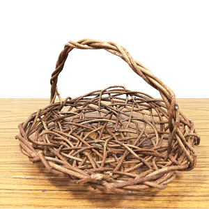 あけび蔓を少し深さが出るよう乱れ編みで通しながら丸く形をつくり、取手を付けたあけびかごです。