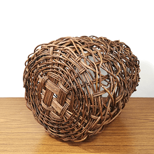 通常ですと、乱れ編みの寸胴かごの大サイズは、2万円以上の価格を付けますが、こちらの商品は、かごの骨組みを短く切ってしまったために、つじつま合わせで縁(籠の口部)が膨らんでしまい、今回は一点物としてお買い得な価格となっております。