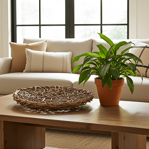 あけび蔓を乱れ編みで通しながら丸く形をつくり、少し深さを付けたあけび細工です。