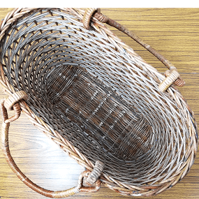 半芯を使用するため、通常の丸芯のかごよりも重量が軽く、かごの内部が白っぽい編み上がりになります。