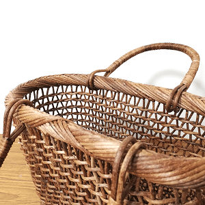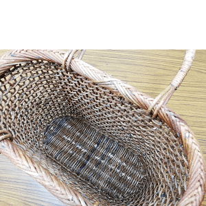 編み芯をねじりながら上下互い違いに編み込んでいくので、骨組みであるたて芯が蛇行する形でしっかり固定され、かご本体の強度も高く、物を入れてもヨレたり型崩れをすることはありません。