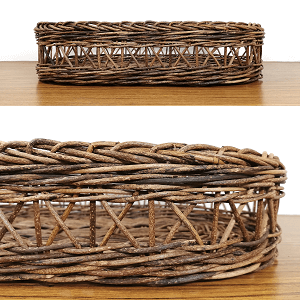 矢来編みと呼ばれる透かし模様がかご全体に入っており、かごの骨組みを「筋交い」のようにバッテンに交差させることで、かごを頑丈なものにしています。