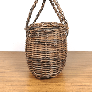 黒っぽいあけび蔓をだくさん使用し制作した、胴張り型、グニ手のミニかごバッグです。